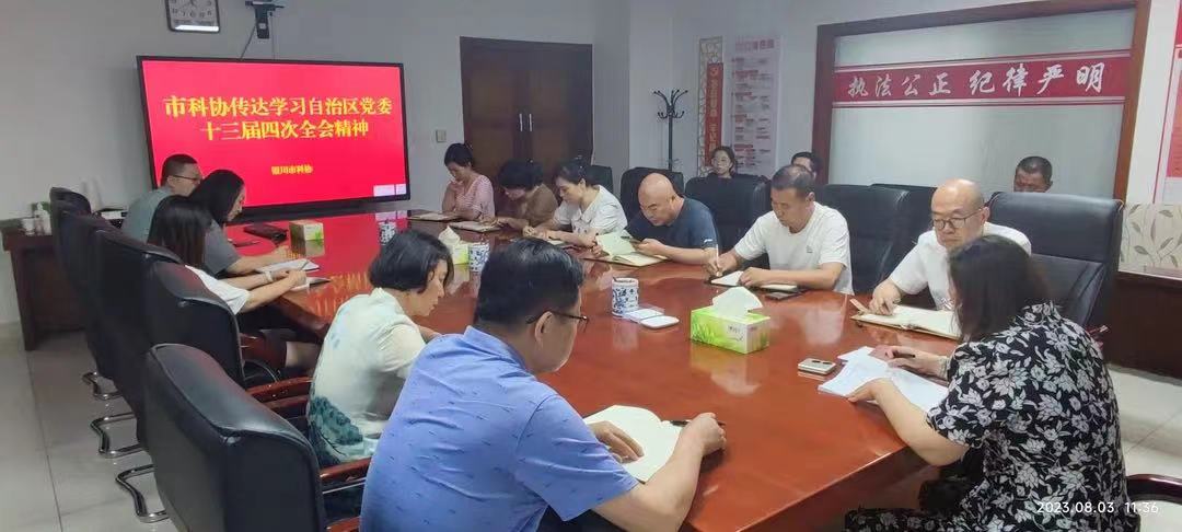 8月3日,市科协召开全体干部职工集体学习会议,再次传达学习自治区党委十三届四次全会精神,原原本本学习《中国共产党宁夏回族自治区第十三届委员会第四次全体会议公报》和梁言顺同志在全会上的两次讲话,安排部署贯彻落实工作。